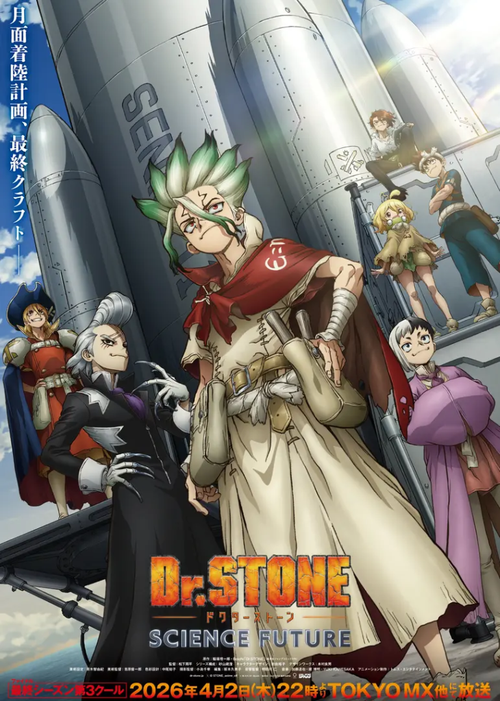 Dr. Stone is now coming to an end. I have been following this anime since its premiere at Anime Expo in 2019, and have been a huge fan ever since. The first and second cour had me at a chokehold every episode, and it was my personal favorite anime of 2025. I hear that Senku and the crew will be going to space this cour, so I can’t wait to see that! It will also be sad to see this end, but I do believe that this anime will end on a great note.